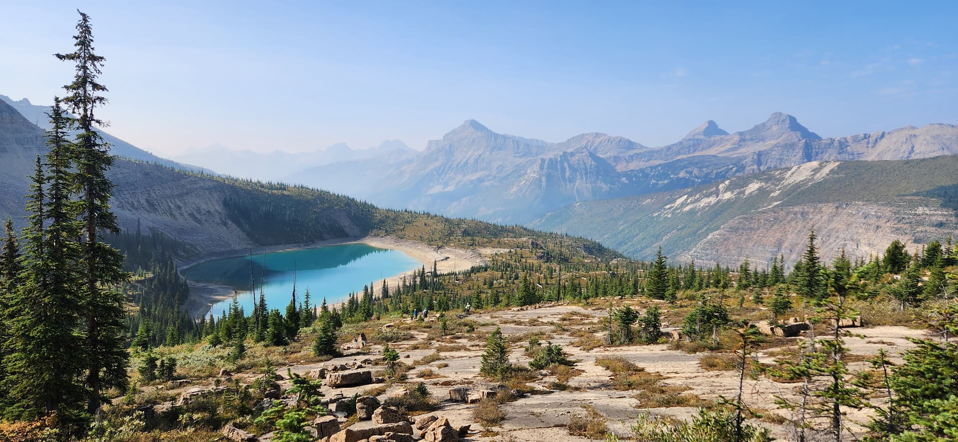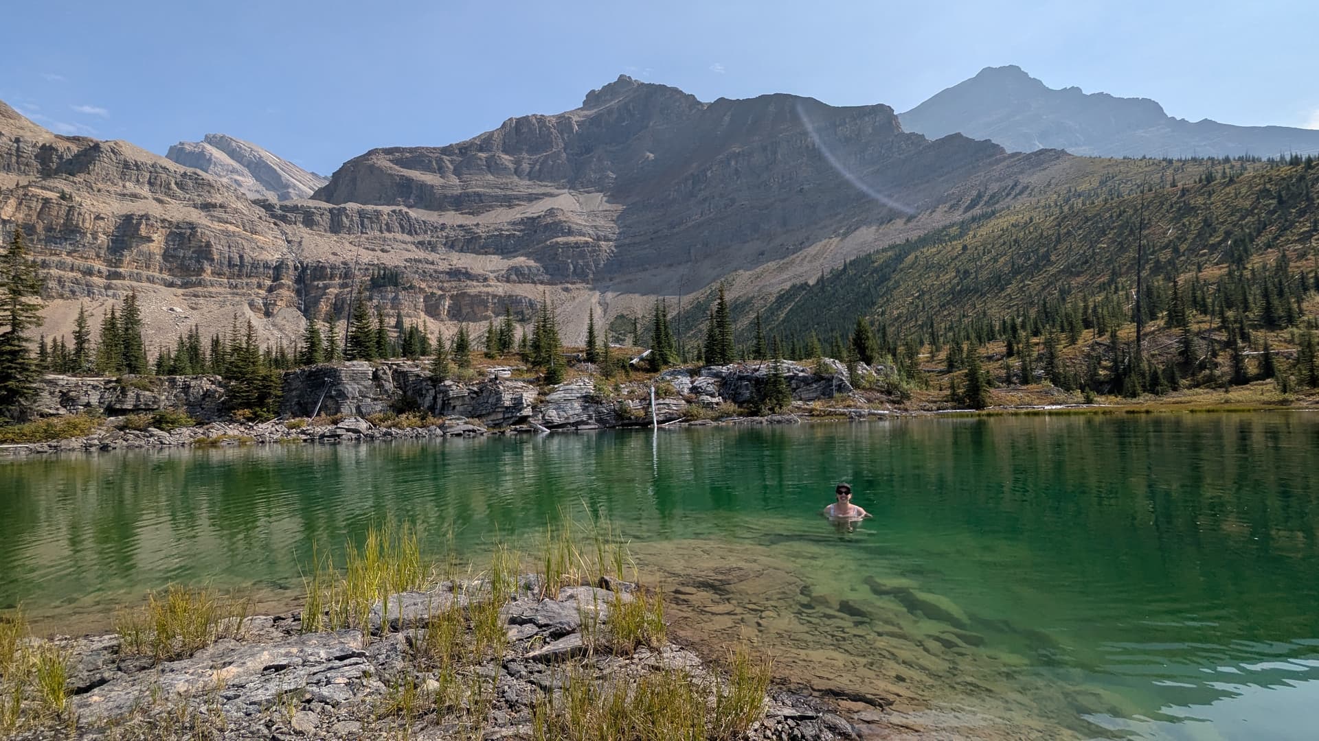 On the Saturday the entire group hiked south along a rocky plateau to Amiskwi Lake (1st photo below) and a second unnamed lake (2nd photo below) just over a small ridge from Amiskwi Lake. As it was a hot day dips were happily enjoyed in both gorgeous blue and blue green lakes by many of the group.