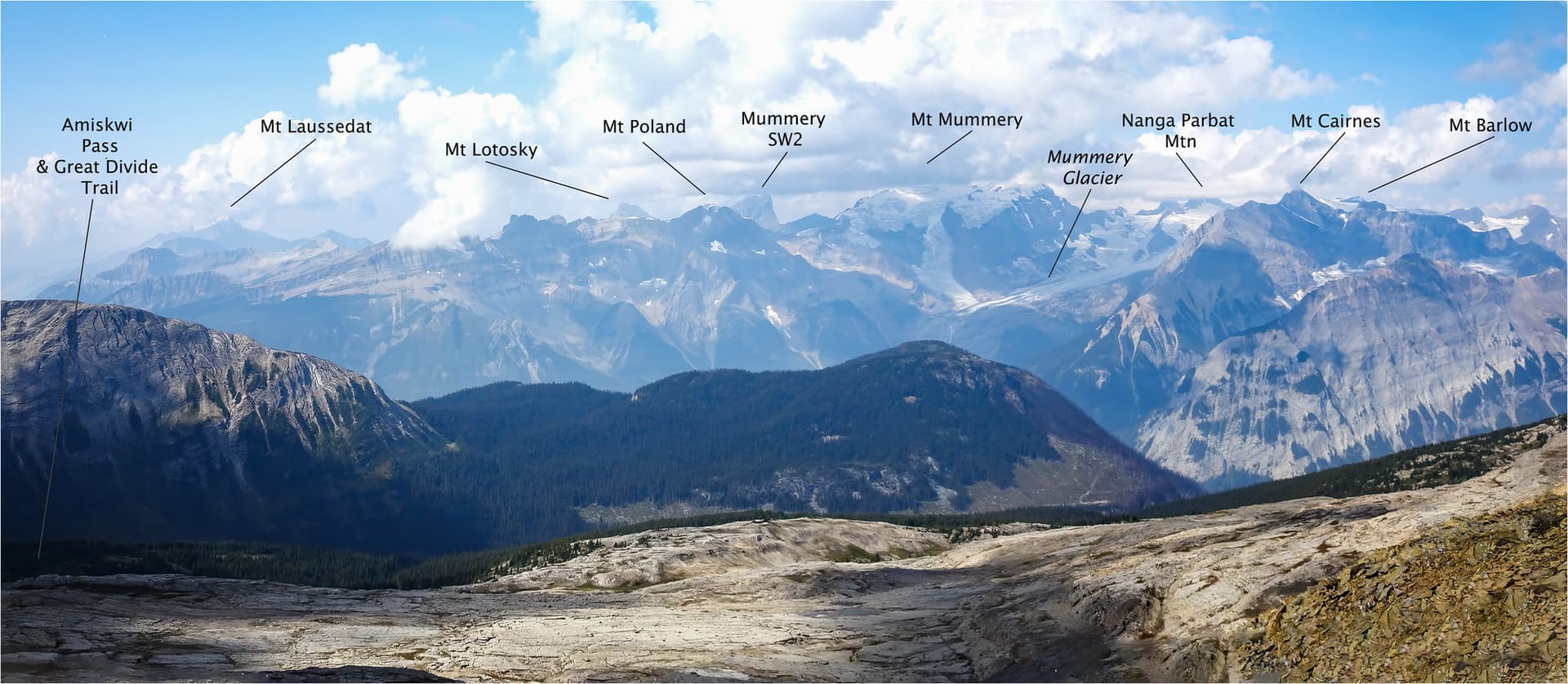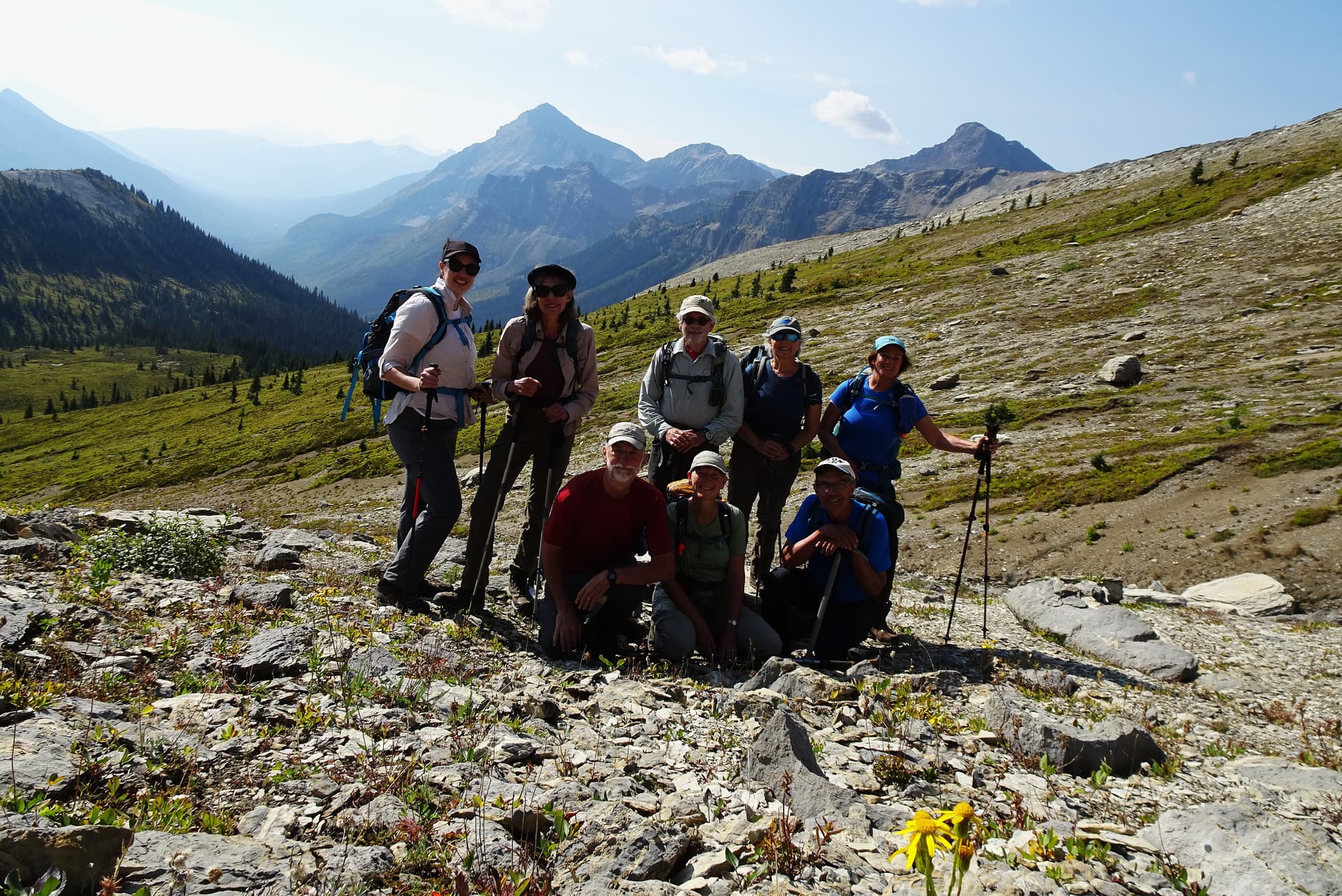 Folks paired up to cook dinner for the entire group twice in the week and made their own breakfasts and lunches. Dinners were outstanding and most were enjoyed on the large deck with a stunning view to the Mummery Glacier. Although the week started with some smoke from a fire nearby in the Blaeberry Valley, a rain, thunder and lightening storm on Sunday night cleared out about 85% of the smoke so that our hikes later in the week had much clearer and further views.