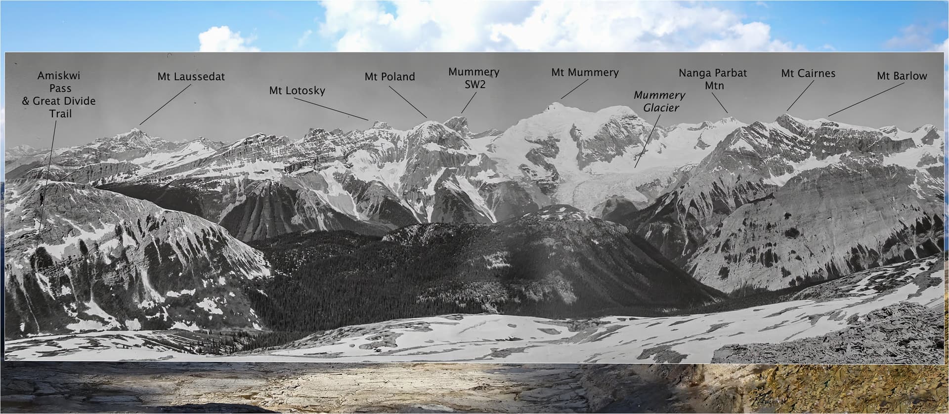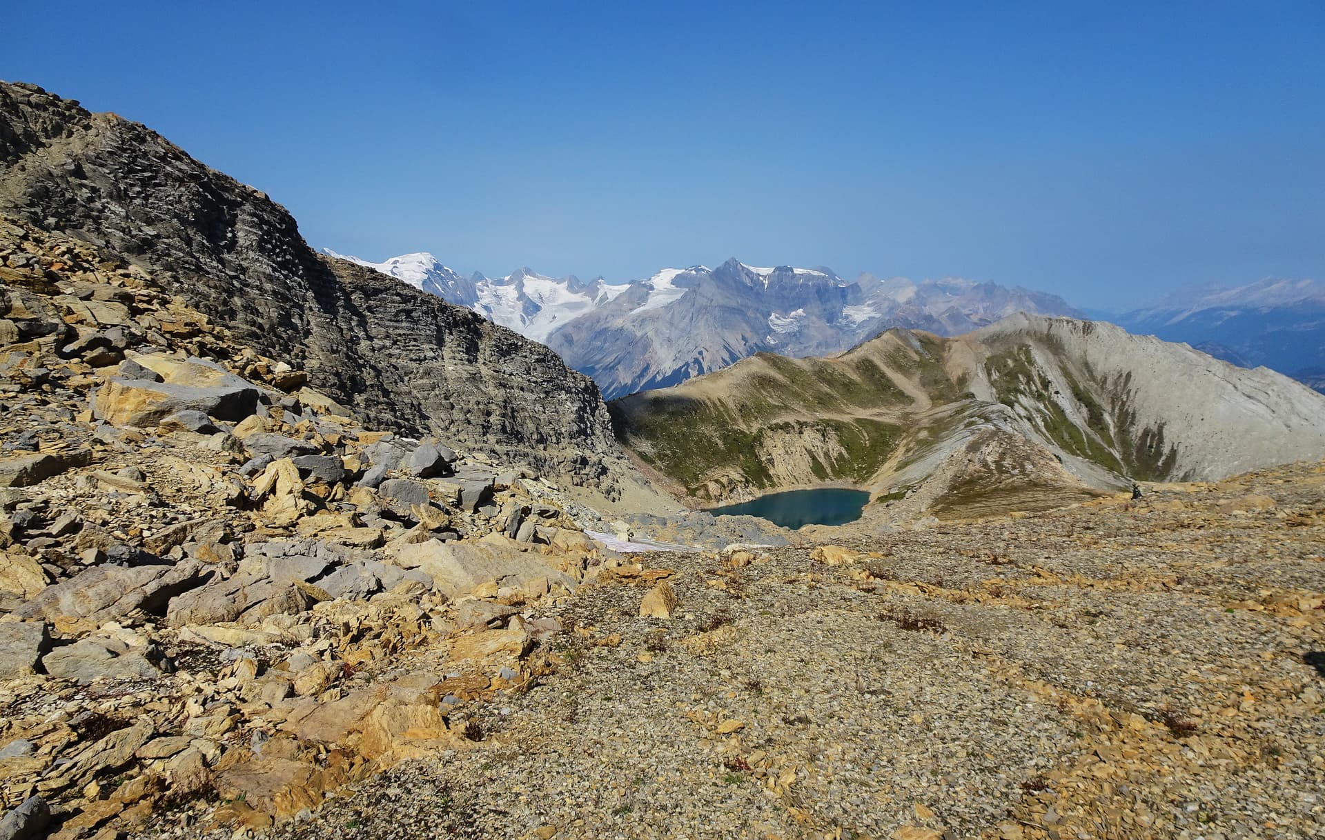 We traversed higher on this bowl to head up a loose rocky draw to a col on the right side of, what I believe, was Hagen NE2 Peak. That was a grunt but well worth the view from the col. Our lunch spot there gave us a view down to the small lake, ridges above it and the Mummery Glacier behind those ridges (photo below).