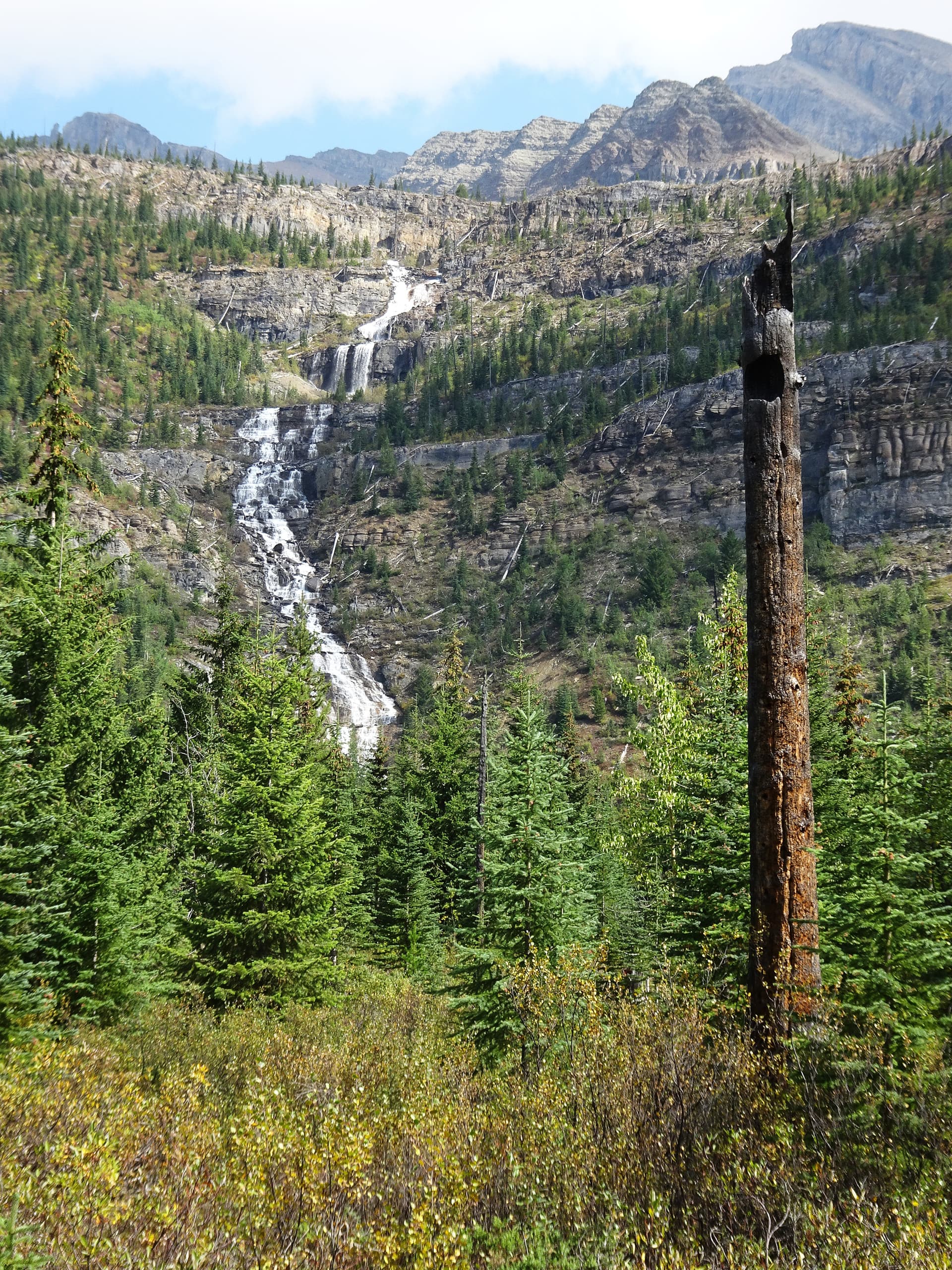 On Sunday through Wednesday smaller groups formed to hike to multiple locations. Jenny & Ian were especially interested in hiking sections of the Great Divide Trail both below the lodge in the forest and the alternate route above the lodge and did several days checking out the condition of the trail, since Jenny was one of the original planners/creators of this incredible trail~! One highlight on one of those hikes down the valley to a confluence of the Amiskwi River with another was this great view up to a waterfall that poured out of Amiskwi Lake.