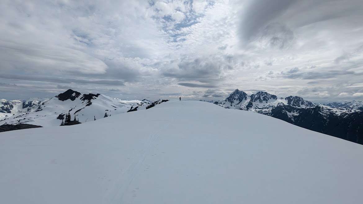 Was a warm and sunny day as we made our way up to the ridge between McBride and Morrison Spire. Snow was very wet and slushy which added some excitement skinning up the steeper sections. Lots of potential routes and some good turns to be had on the way over to the ridge. We followed the obvious main bowl up to the top of the ridge. Provided some nice turns on the way down. Beautiful views from the ridge top.