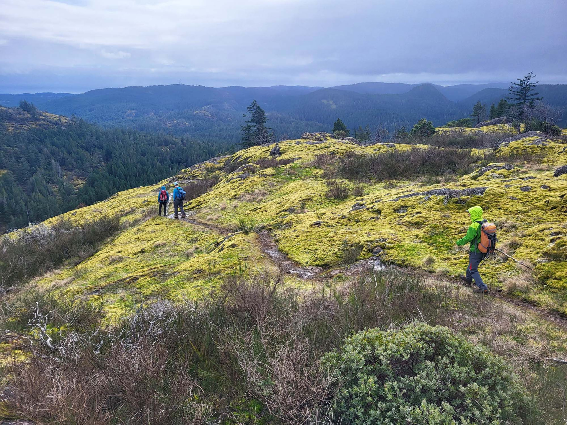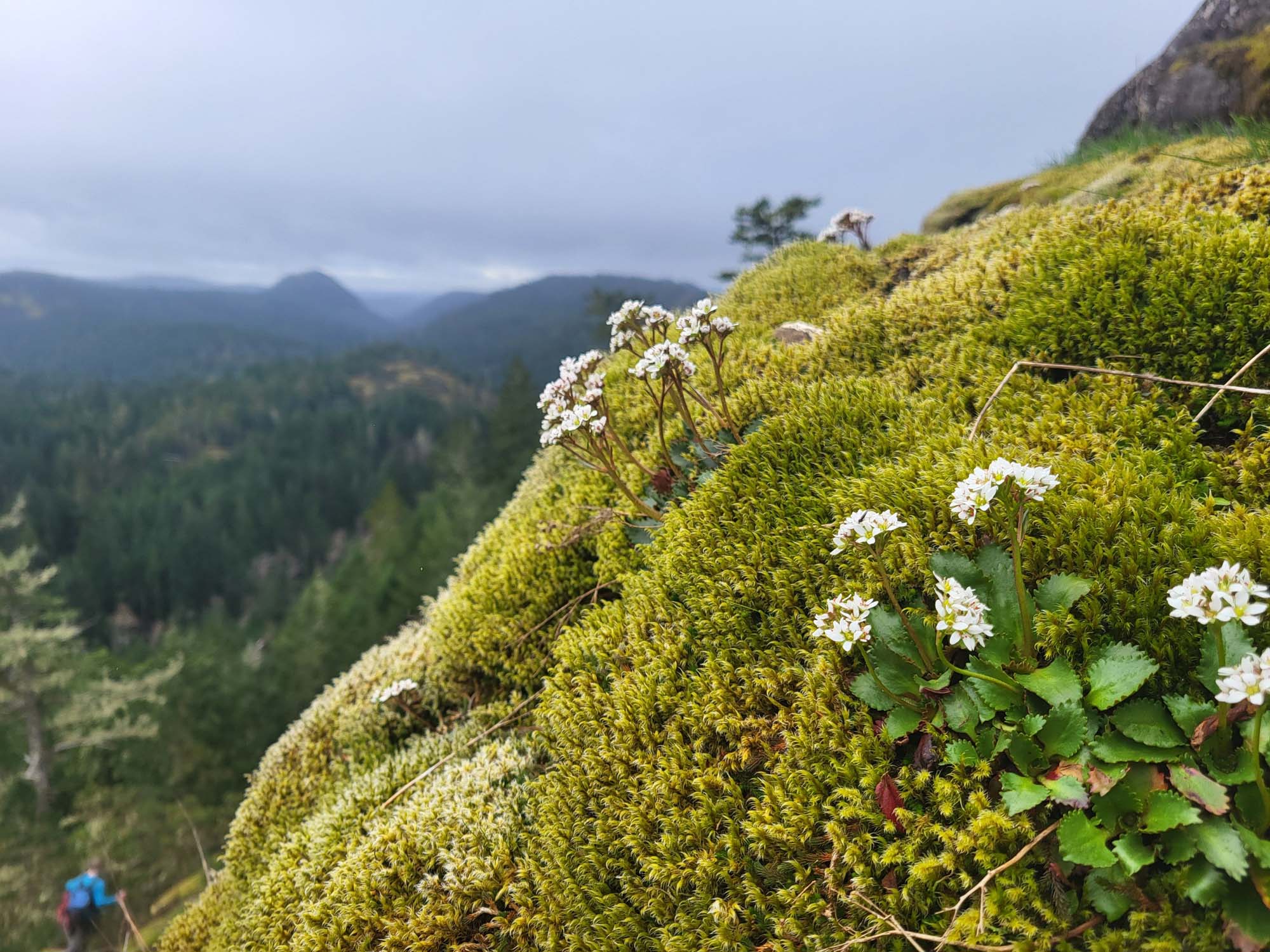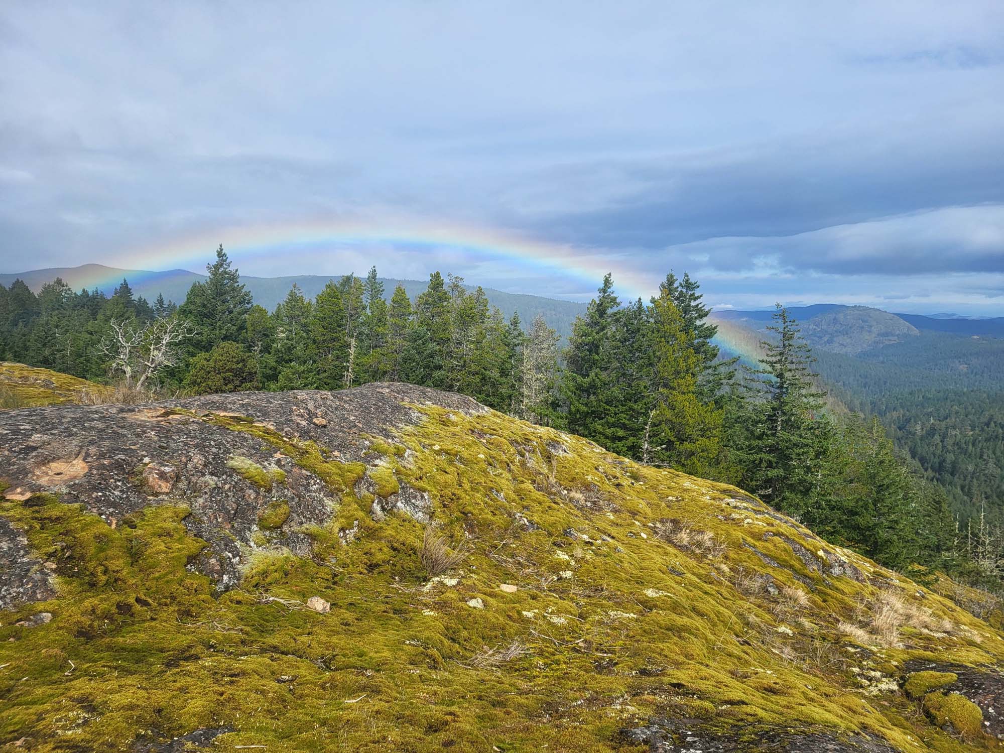 On Saturday 7 March 2026 Catrin Brown and Dave Suttill co-lead a loop hike over Mt Braden in the nearby South Section of the Sooke Hills Wilderness Regional Park. Participation was on the low side with the addition of Ken W and Martin D coming out. However, it was a great trip all the same. The weather was generally overcast, with occasional light sprinkles, and enough sun to make for one really nice rainbow. The hike took us around the west side of Mt Braden to a high point on the ridge known locally as Castle Pk, then on to Mt Braden itself (479m), and on down the southeast side via Plateau Peak. There was not much of a showing of spring time flowers except for the lower south facing slopes of the ridge leading down from Plateau Pk. Total distance covered 11.5 km, cumulative elevation gain 550m.