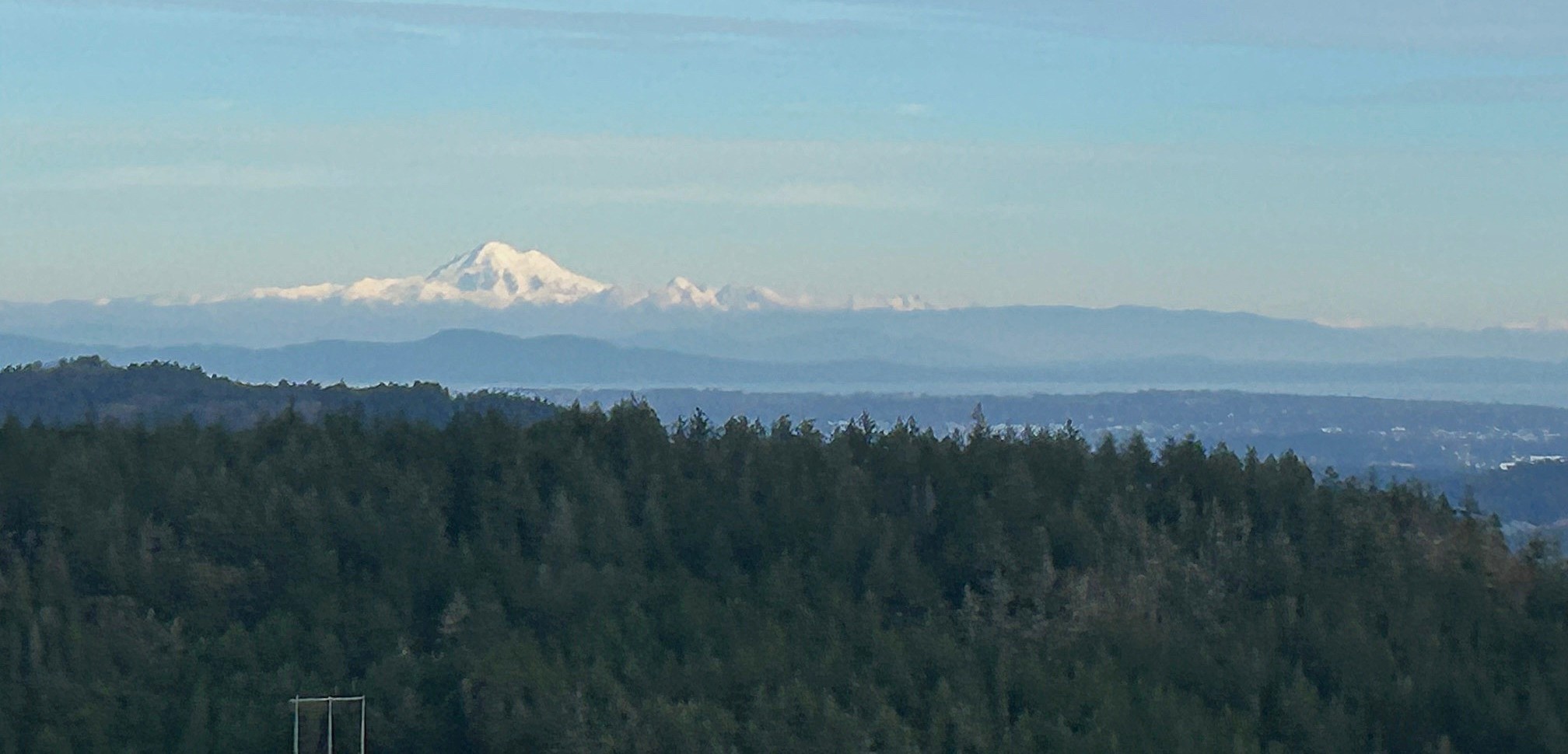 In consultation with the group we decided to skip Mike Hill and instead carry on to Crowsnest via a slightly bushwacky route up up the west slope that went extremely well and was barely bushy most of the way. The summit of Crowsnest was pretty windy, so we just paused for photos and oogling of the great view of Mt. Baker in the distance (photo below from Crowsnest, minus Roger taking the photo. Second photo a closeup on Mt. Baker).