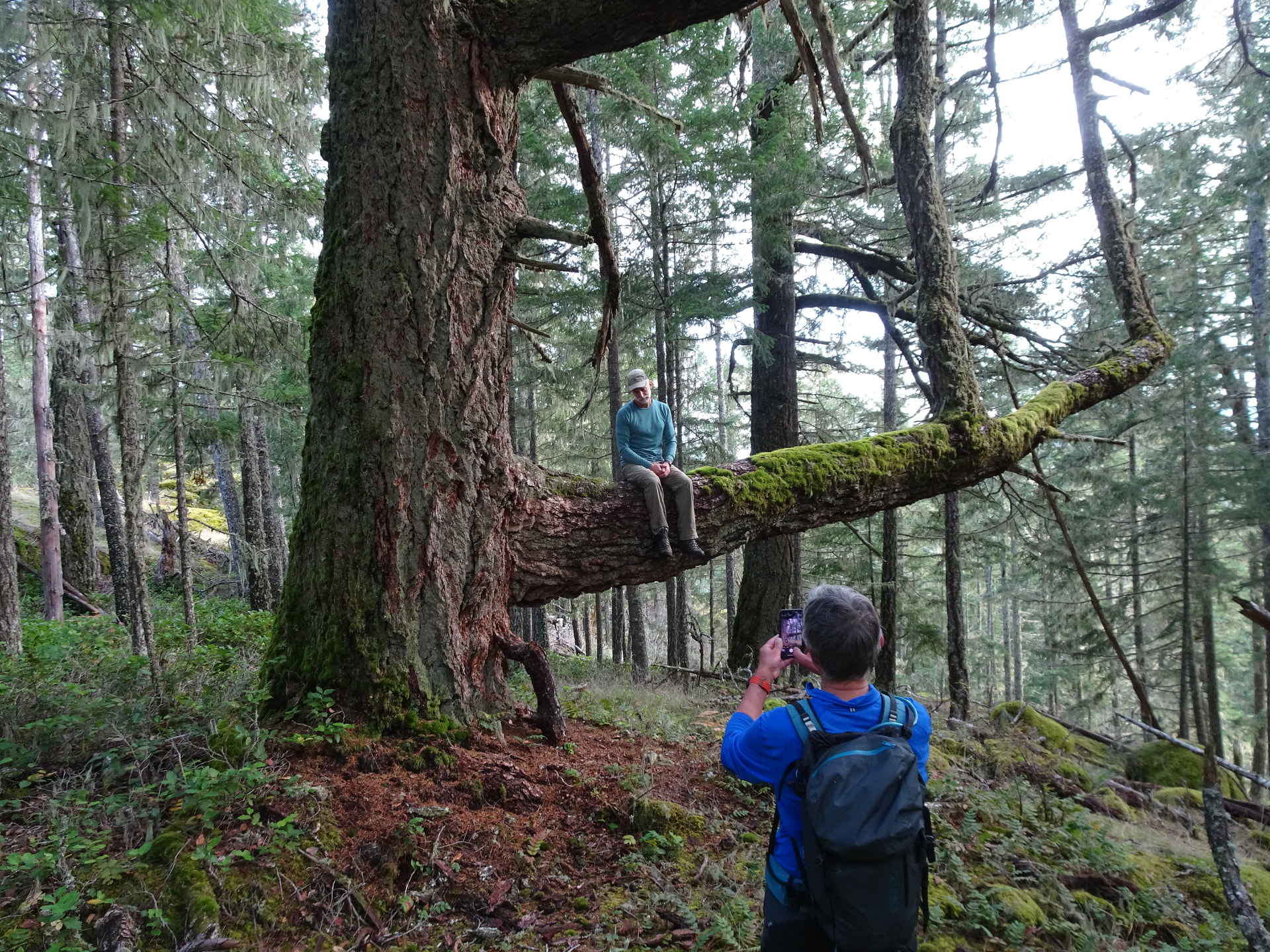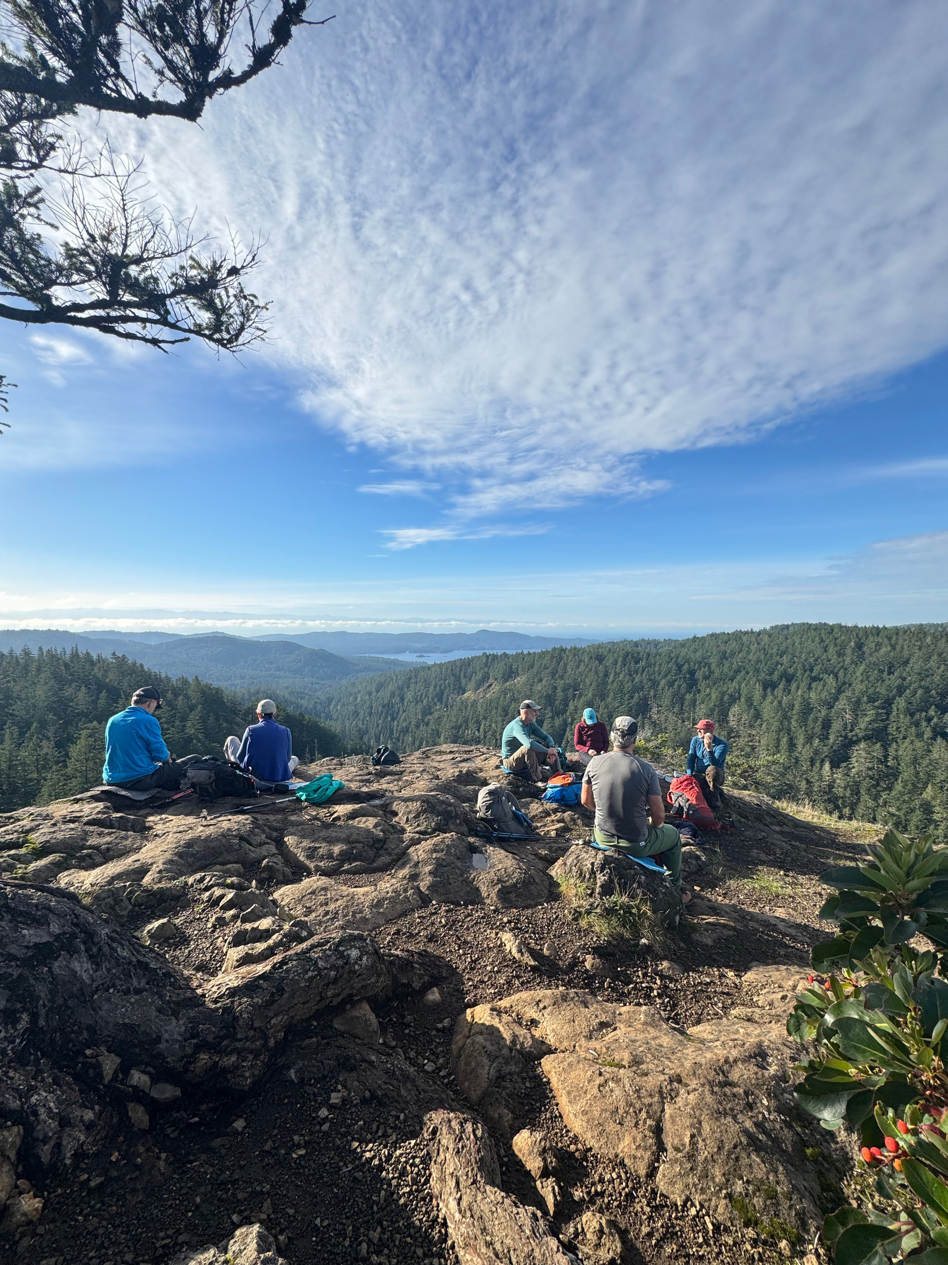 After about a 15 minute or so stop we carried on down the steep north side trail (Sue’s Trail) and took a left onto the Jurrasic Trail and another left onto the Jurrasic Park trail to Eagle Bluffs sometime around noonish. This area is particularly wonderful for the larger, and well spaced trees - a delight to wander in. (Roger pictured in one of our favorite climbing trees….sad that Mike is not with him!) At Eagle Bluffs another stunning view over to the Washington Peninsula was beheld and we took our lunch break there. Many in the group had not been to this area, so it was lovely to share this great nook of the local hills with them!