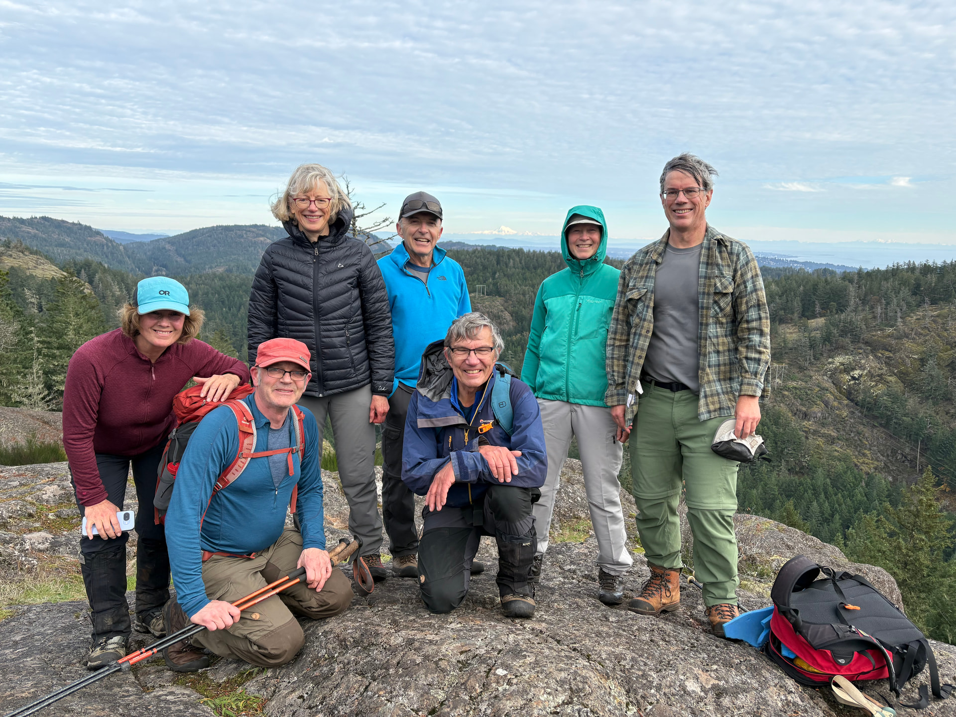 Our day trip started at the Sooke Hills Wilderness parking lot in cool, but clear weather around 8:30 AM. We headed to Sugar Lump (the bump south of Sugar Loaf via the old southern route of Amusement Park, Camus Col and Fish Ponds trail. We veered left off Fish Ponds on a faint trail to top out on Sugar Lump for glimpses east over to the Olympic Mts. (I will use the John Hasell trail names, as that is what I am familiar with). We only briefly stopped there and then headed north up to Sugar Loaf (group pictured there in photo below) where we took a tea and snack break to fully enjoy the full view over to the Olympics - a glorious view!