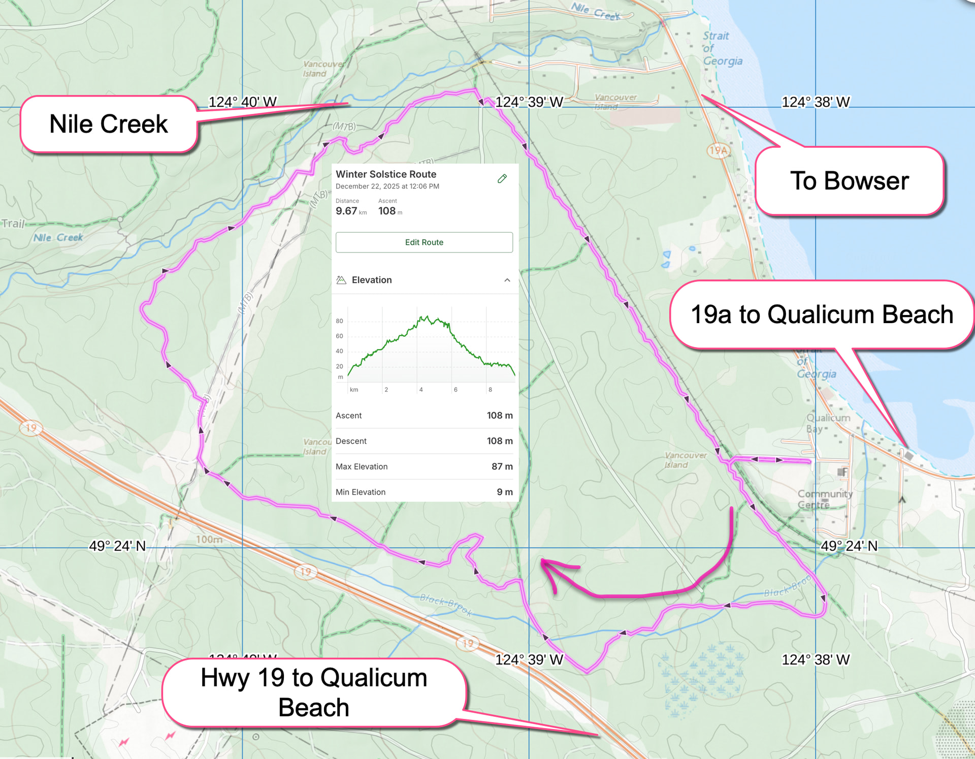The Regional District of Namaimo has recently upgraded the main trail so that it is level, consistently surfaced with crushed rock and installed a ‘tapping rail’ for walkers who are visually- and balance- impaired.